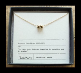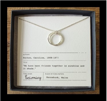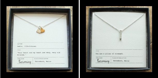 Becoming is handcrafted jewelry made in Maine, that can be worn every day. The sterling silver line is about small things with a big meaning: a word becomes a mantra, a place you wish to remember, a gentle nudge to pick you up, a deep breath, a person you hold in your heart, a date you’ll never forget. It’s about celebrating everyday moments and milestones, a gift to give yourself or someone you love.