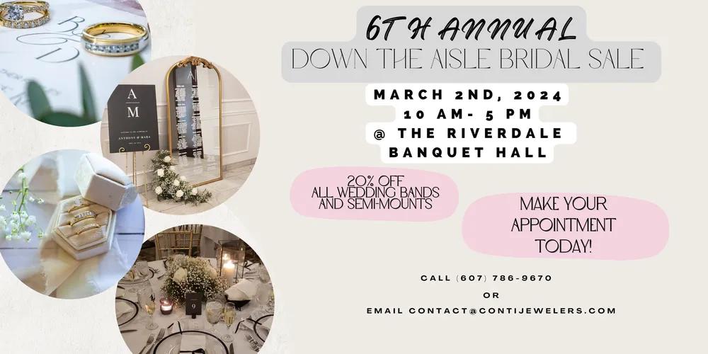 And that's not all - with every purchase, you'll receive a luxury gift bag and be entered to win exciting raffles from over 20 vendors. Don't miss out on this amazing opportunity to find your dream wedding bands, all on sale now at Conti Jewelers. What's more, our entire sale selection is available online through Sunday, March 3rd, so that you can shop from the comfort of your own home.